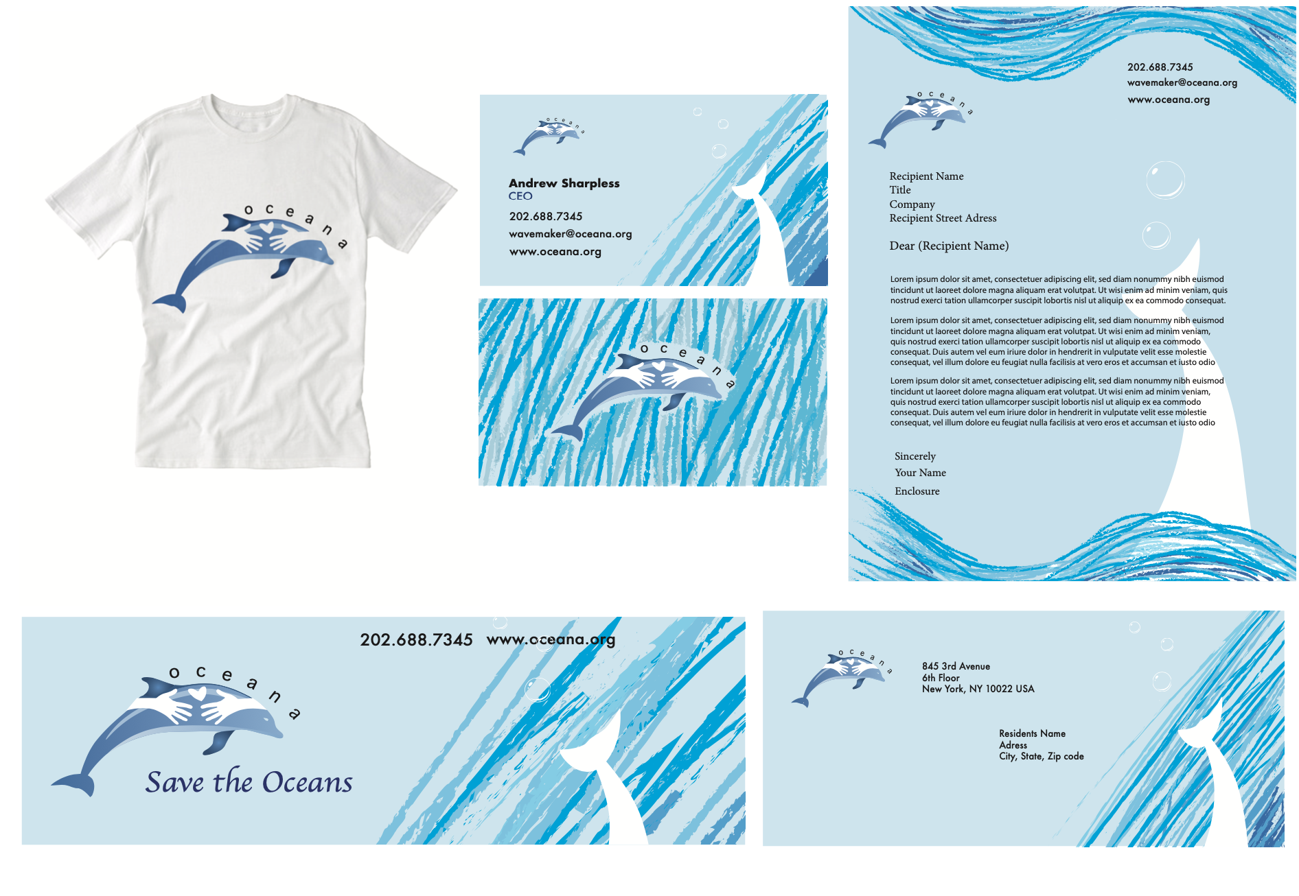 For this project I created an integrated identity for a organization that exists called Oceana. I created a envelope, cover letter, water bottle wrap, banner, and business card. My target audience I focused on is everyone who loves oceans and want to save the oceans. For this design I focused on the oceans and the animals that live inside of them. I used illustrator to create hands and you would see the essence of the hands touching the dolphin to represent protection. Also, I used a crayon digital material to create the water. Also, my choices of fonts are really simple and natural to fit the overall theme.