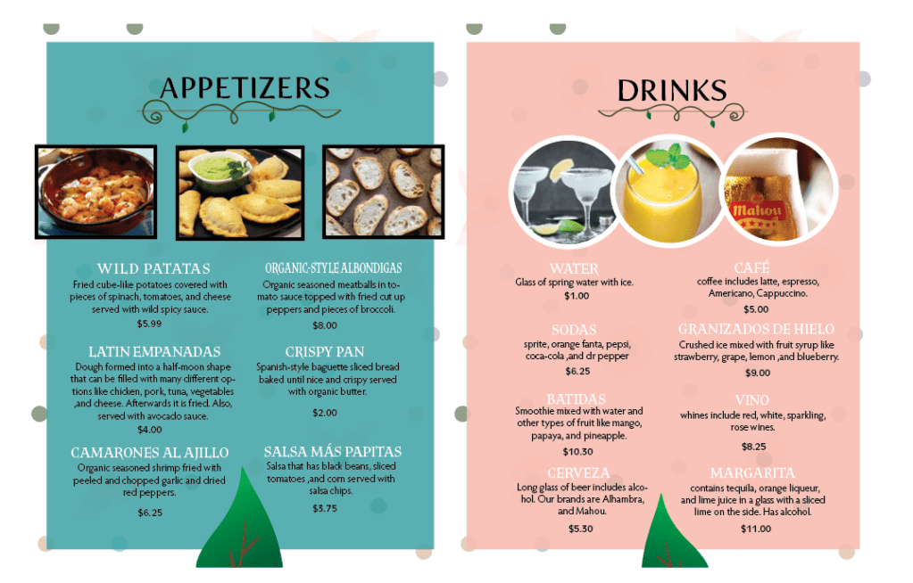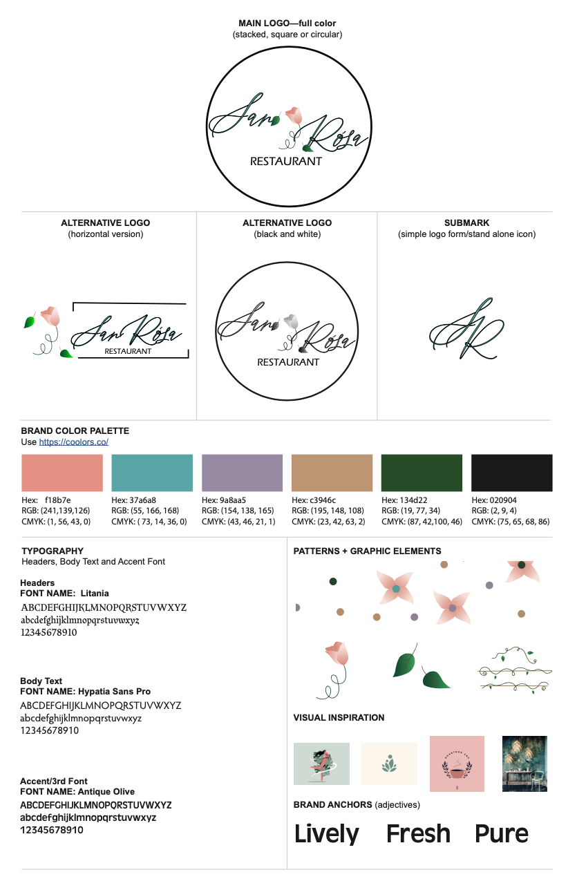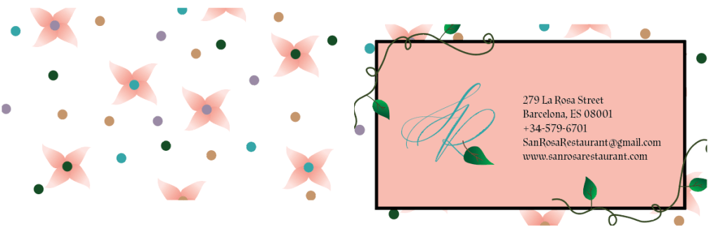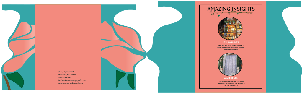 For this project I created a restaurant called San Rosa that sells Spain based food. I created the menu, dessert menu, business card, and open gate cut out for the restaurant. The target audience is people who like Spain food and as well as want to try a new type of food style. When laying out this design I based it on nature choosing illustrations that express that and as well as illustrations that go along with the name San Rosa. With the color palette (green, pink, and white) I wanted the brand colors to stand out and be remembered. Also, fit well with the nature theme. While organizing the design I wanted the audience to easily navigate everything.